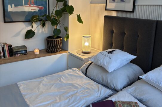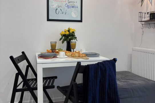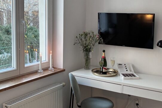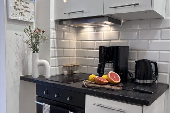 Apartament składa się z sypialni, w pełni wyposażonej kuchni (z lodówką i ekspresem do kawy) oraz łazienki z prysznicem. Z okien roztacza się widok na ogród.